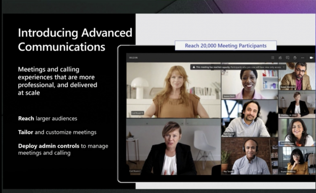 - 1,000-person interactive Teams meetings – “normal” teams meetings but up to 1,000 participants