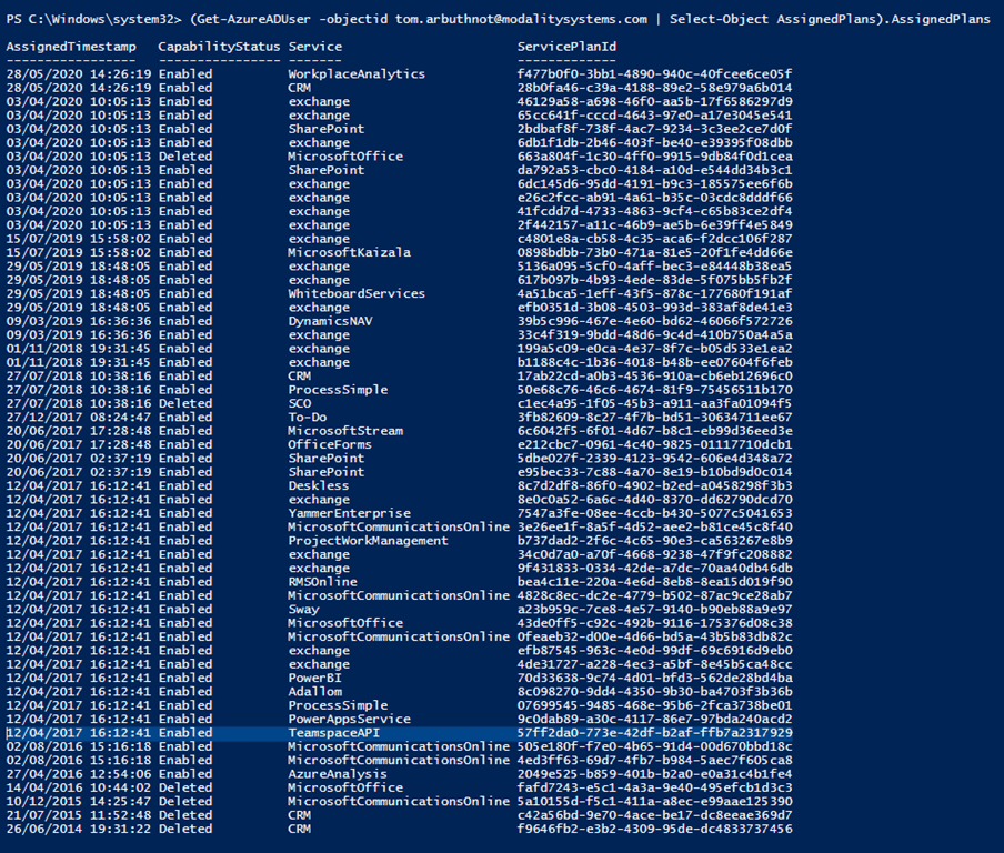 Interestingly we see another Service name here, for Teams its TeamspaceAPI. You can also see if they are enabled or disabled for that user.