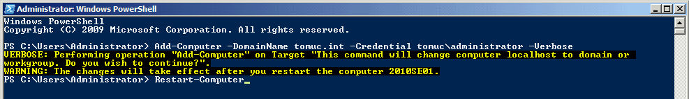 Add-Computer -DomainName tomuc.int -Credential tomuc\administrator -Verbose