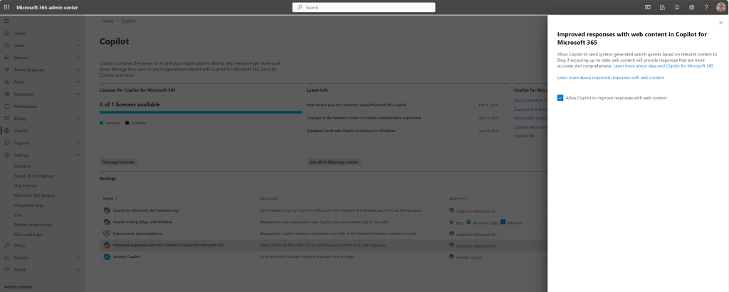 1. Admin setting to allow or disallow Copilot to improve responses with web content