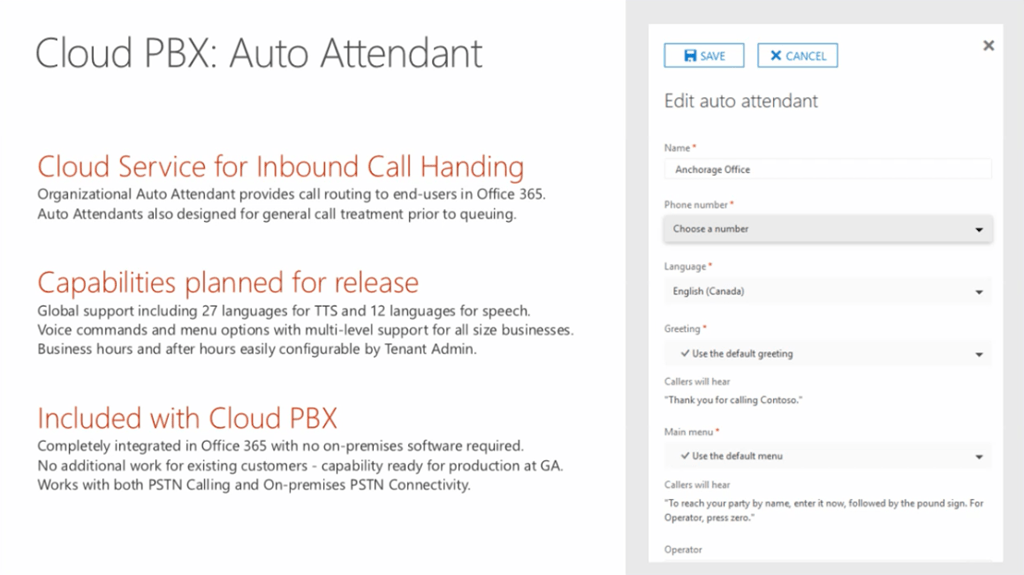 •Interesting that you will be able to route your own “bring your own PSTN” numbers to the Cloud PBX AA/Call Queue