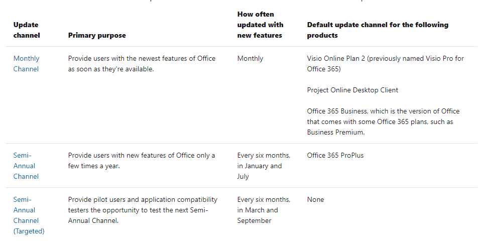 - Semi-Annual Channel – Provide users with new features of Office only a few times a year. Every six months, in January and July