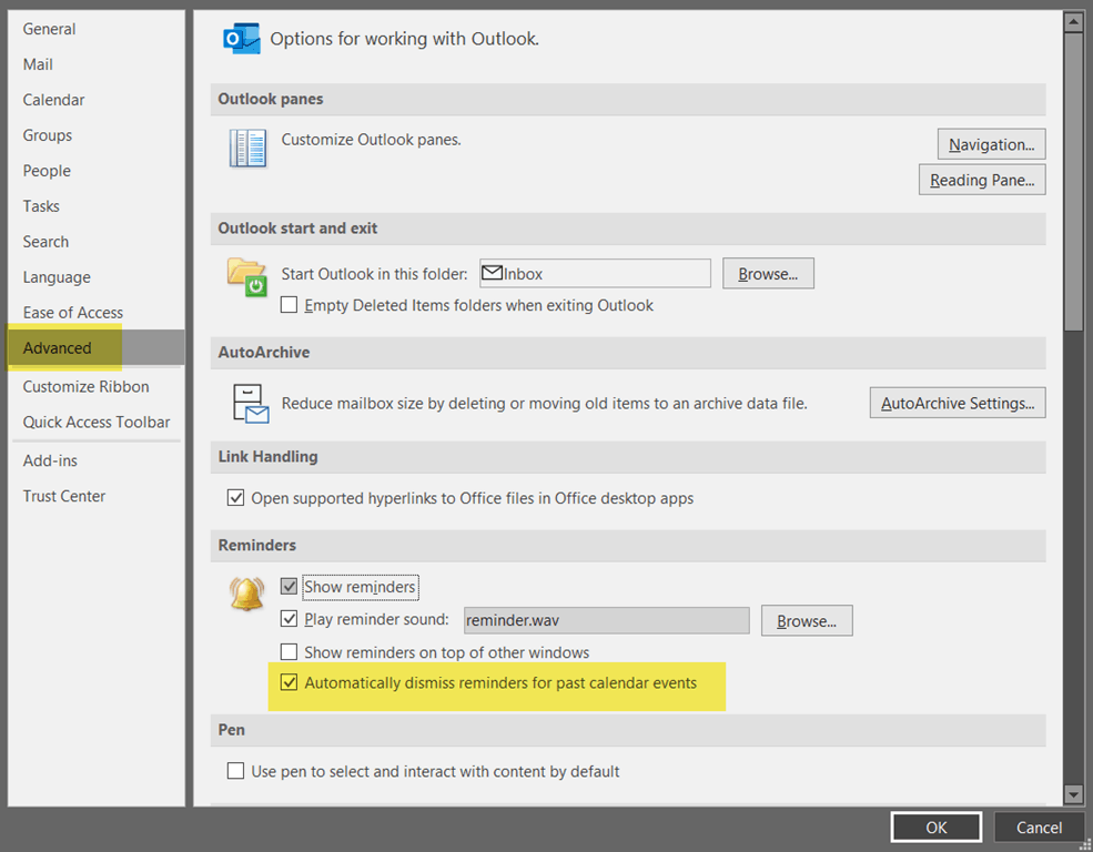Advanced / Tick “Automatically dismiss reminders for past calendar events”