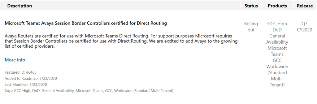 Hot on the heels of Cisco who have certified a number of their session border controllers for Microsoft Teams Direct Routing, we now get official news that some Avaya Session Border Controllers will be certified for Microsoft Teams Direct Routing in 2020 Q3.