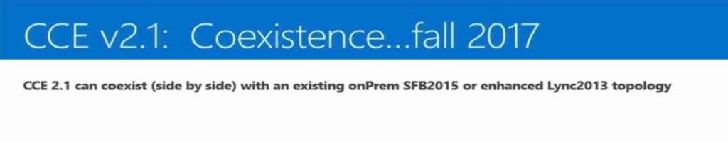 Coexistence will require the next version of CCE, “2.1” due “US Fall” which is October, November, December, or CY2017 Q4It will besupported forSfBS HybridIt will be supported for Lync2013S Hybrid, but like OPCH you will require at least one SfBS pool and Federation Edge. So if you’re a Lync 2013 Install holding out for CCE get deploying at least one SfBS pool nowCoexistence will Require Cumulative Update 6 (CU6) on SfBS (not yet released)Lync 2010 or OCS 2007 R2 will unsurprisingly not be supported, so if you are on these and want to move to CCE you’ll need to look at other upgrade and or migration optionsPrivate TAP (Technology Adoption Program, similar to “preview”) is due to start in August 2017