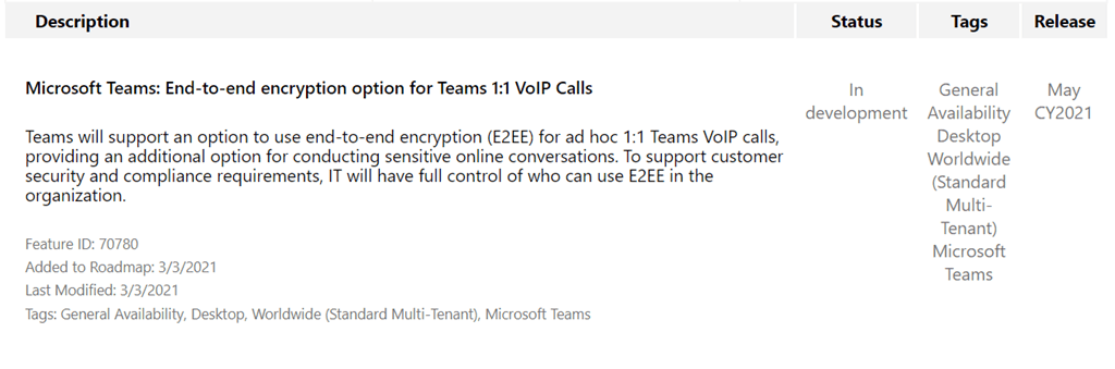 In this first release, customers will have the ability to enable E2EE for 1:1 unscheduled Teams calls. It will later expand to support scheduled calls and online meeting.