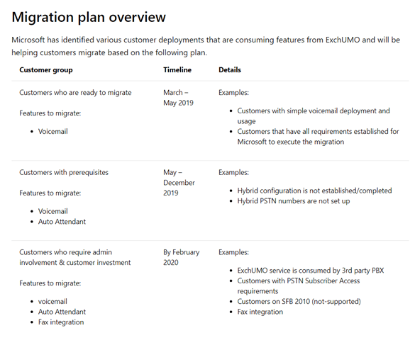 Microsoft is retiring Unified Messaging (UM) in Exchange Online and replacing it with Cloud Voicemail and Cloud Auto Attendant services. If you have Skype for Business 2015 or Lync Server 2013 hybrid connected to Exchange Online Unified Messaging you will be transitioned by Microsoft to Cloud Voicemail on or before February 2020.