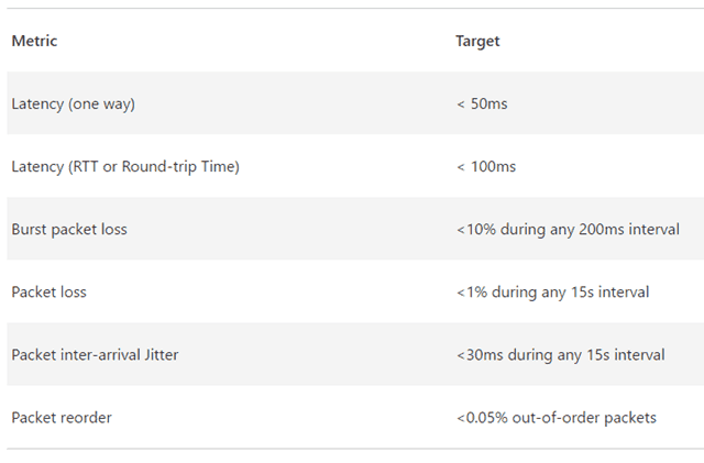 Full details of targets here, lots of great detail: https://support.office.com/en-us/article/Media-Quality-and-Network-Connectivity-Performance-in-Skype-for-Business-Online-5fe3e01b-34cf-44e0-b897-b0b2a83f0917?ui=en-US&rs=en-US&ad=US
