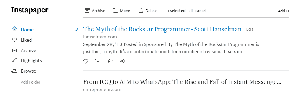 Select one article by clicking on the Summary Body, or to the left of the heading, a top menu will pop up