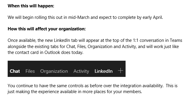Now Microsoft has announced some LinkedIn integration into Teams. Users will be able to see LinkedIn profiles of their colleagues in 1:1 chat, not in the contact card, but as a separate tab in the chat. Initially, this is limited to contacts within the tenant, but as the contact card updates are released, then this will be available for all contacts within and outside the tenant.