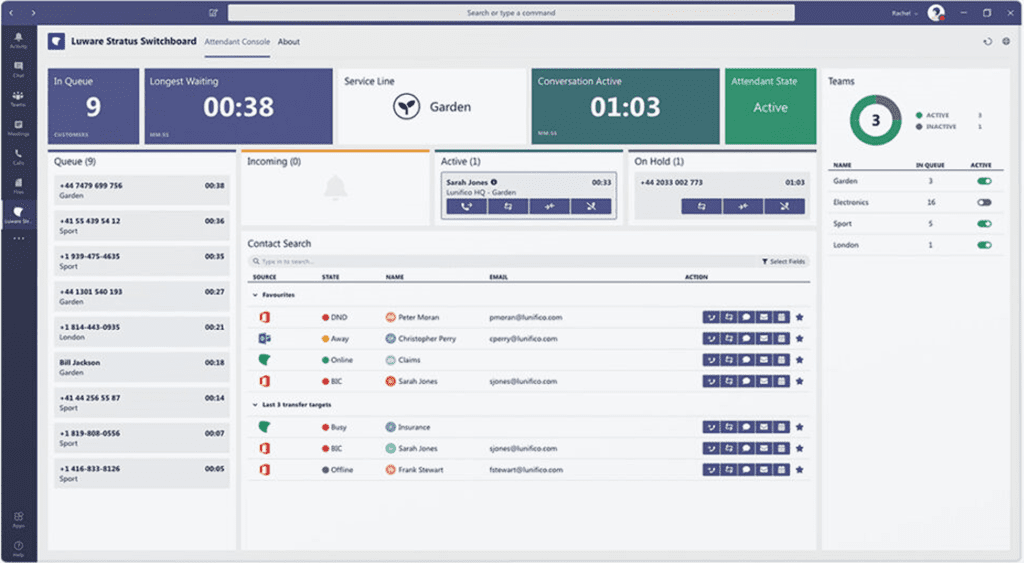 - Attendant Console, integrated into Microsoft Teams with search and CRM integration. It needs to be combined with Advanced Routing or Enterprise Routing.