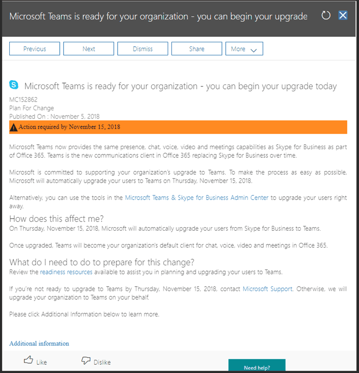 The messages are being posted under “Plan for Change”. I think they should really go under the category “Major Updates”, especially when you consider the messages are being posted just weeks before the automatic upgrade happens. Emails seem to be going out to some Office 365 admins too, Whatever you feel about Teams (I think it’s great and better than SfB Online in a lot, if not most use cases), this is a big change to end user experience. Further, I think smaller tenants are exactly the ones that wouldn’t regularly check the Office 365 message centre/read the update emails.