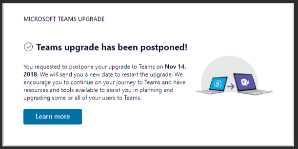 I’ll post more details as I have then, but it appears that some “small” (possibly sub 500 seats) tenants with limited SfB Online usage (scenarios Microsoft believe can also be achieved in Teams) are being scheduled for automatic (no admin interaction or approval) “upgrade” (user migration) from Skype for Business to Microsoft Teams with a very short time period between the notification and automatic upgrade. There is an option to postpone the update should you want to.