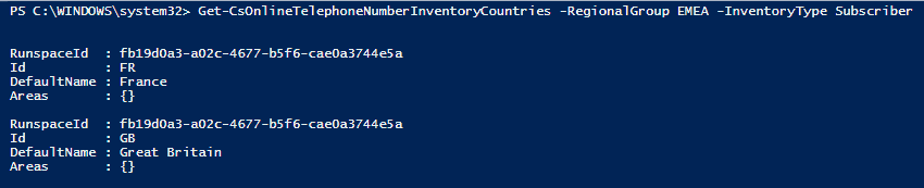 Get-CsOnlineTelephoneNumberInventoryCountries -RegionalGroup EMEA -InventoryType Subscriber