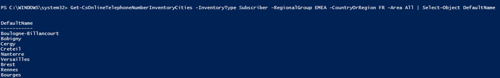 Get-CsOnlineTelephoneNumberInventoryCities -InventoryType Subscriber -RegionalGroup EMEA -CountryOrRegion FR -Area All | Select-Object DefaultName