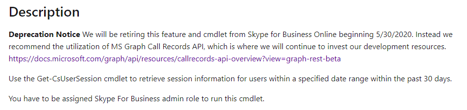 Use the Get-CsUserSession was a PowerShell cmdlet to retrieve user-session information for Skype for Business Online. On 7th May, Microsoft updated the online documentation to say it is depreciated and to move to use the new call records API. Thanks to my colleague Simon Gardner for the heads up on this.