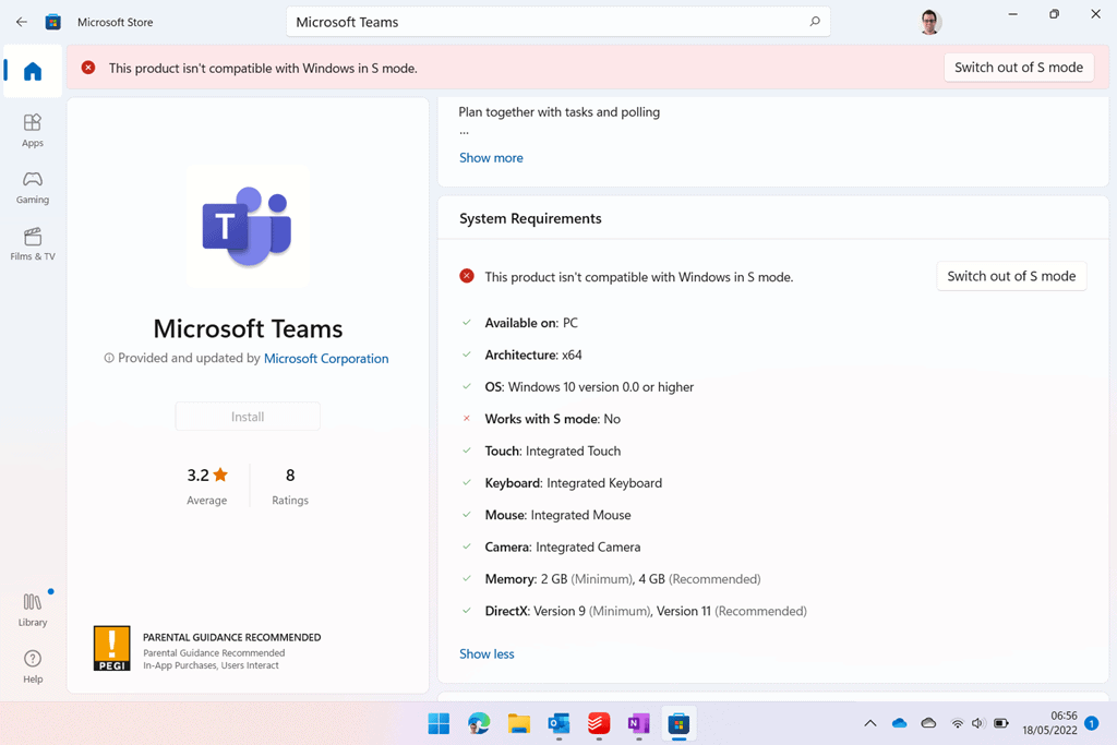 This is the same electron-based version of the client you get if you download it directly from Office 365/Microsoft outside of the Microsoft Store, not a new version of the client. As it’s electron/win32 it’s not supported in Windows S mode (a version of Windows locked down to only non-win32 Microsoft store apps) and it’s not Teams 2.0 for work/school.