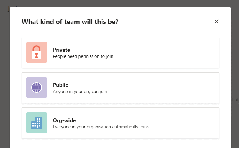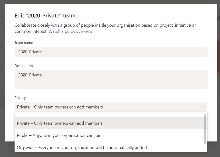 I’m not in love with the public and private as these types have no bearing as to there being external guests (from other organisations/tenants) in the team. Open and Closed might make more sense, but it is what it is.
