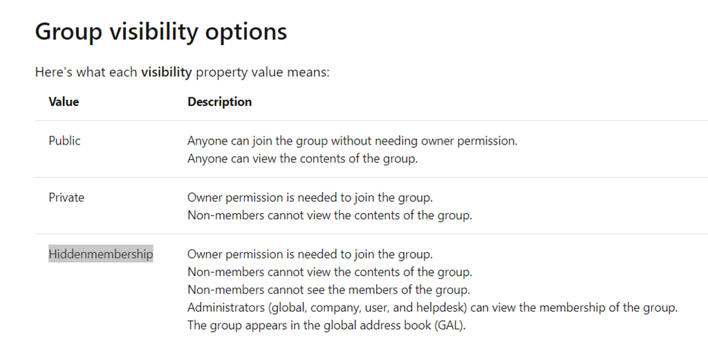There is also another “visibility” option that can be set if you create teams from Microsoft Graph API, “Hiddenmembership”. This is different from discoverability but is also legacy.