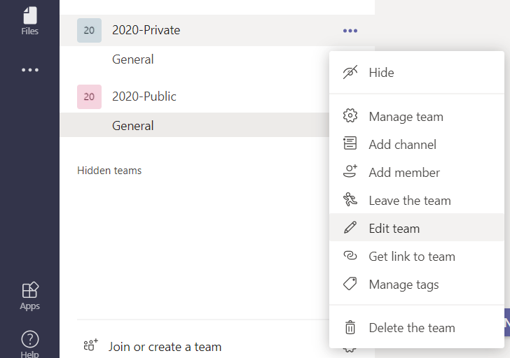 Owners of the team can later chance this “Privacy Type“ by going to “…” / Edit Team