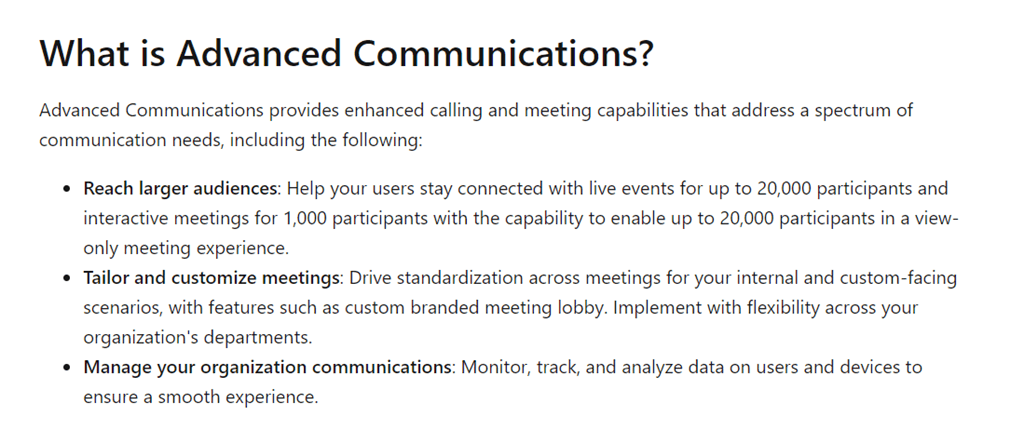 With the recording API and Contact Center API removed, I wonder if $12 PUPM is the right price for the meeting features. Maybe Microsoft will add more features to advanced comms licence like the upcoming webinar features.