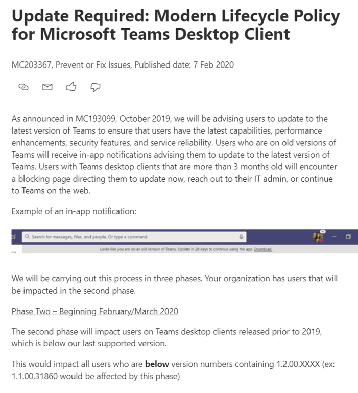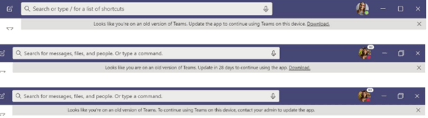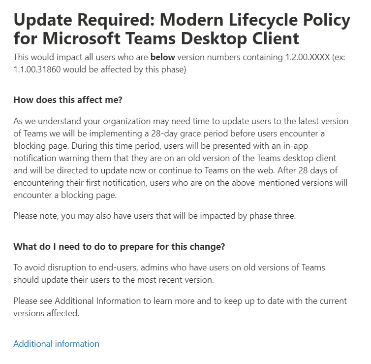 Users with Teams desktop clients that are more than 3 months old will encounter a blocking page directing them to update now, reach out to their IT admin, or continue to Teams on the web.