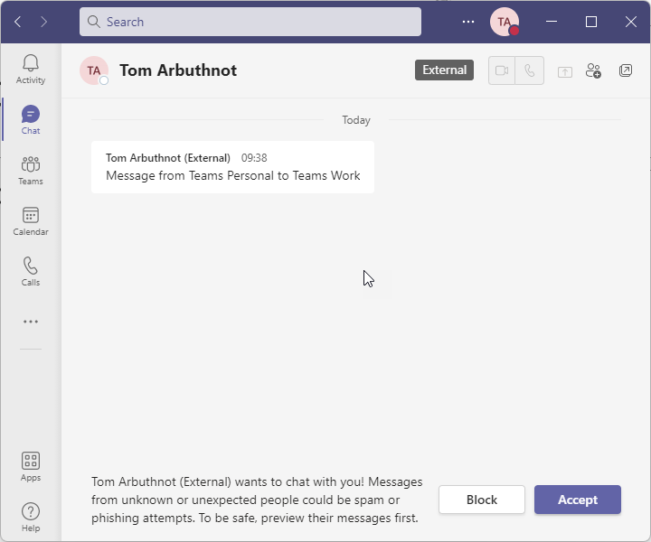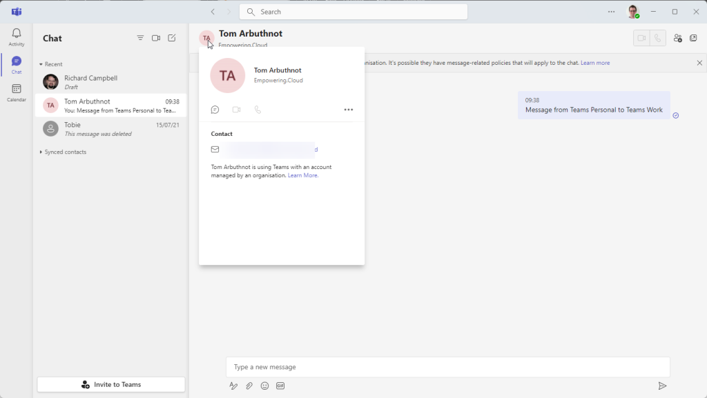 Teams Personal sending first message to Teams Work
