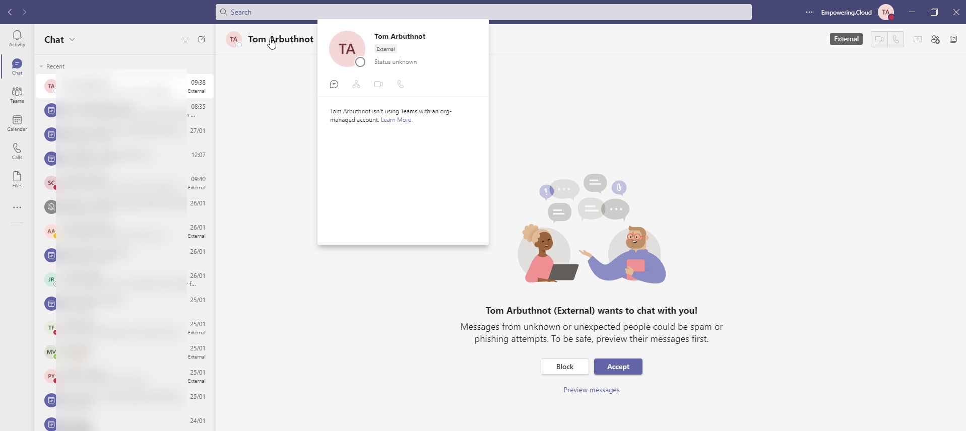 • Explicit opt-in on a per chat basis: end users are not shown messages unless they click to preview, are reminded of the risks of external chat, and are asked to explicitly accept or block the message request.