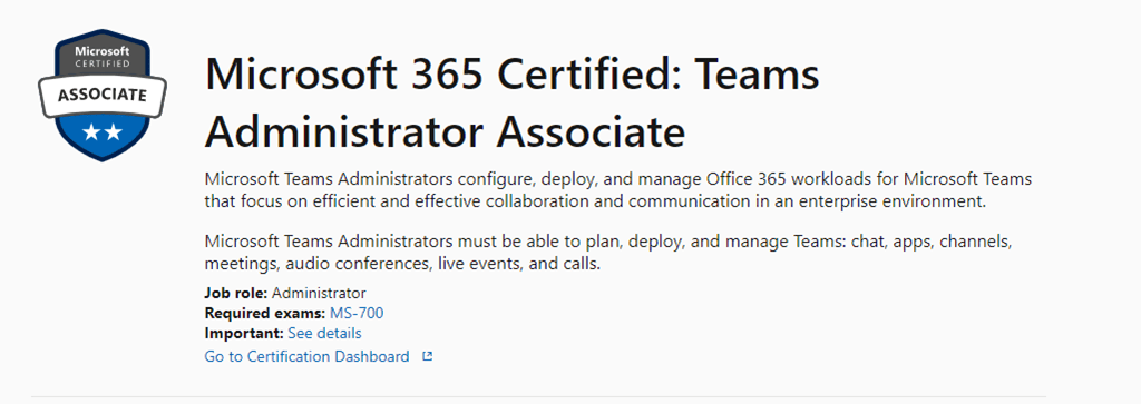 The single Microsoft Exam MS-700: Managing Microsoft Teams gives you the Microsoft 365 Certified: Teams Administrator Associate certification.
