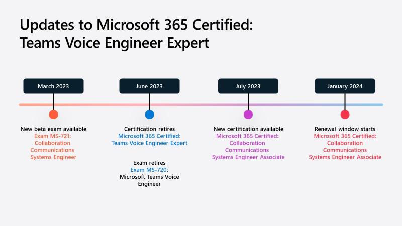 If you already have the MS-720, On July 1, 2023, you’ll see both the original Microsoft 365 Certified: Teams Voice Engineer Expert and the new Microsoft 365 Certified: Collaboration Communications Systems Engineer Associate on your transcript.