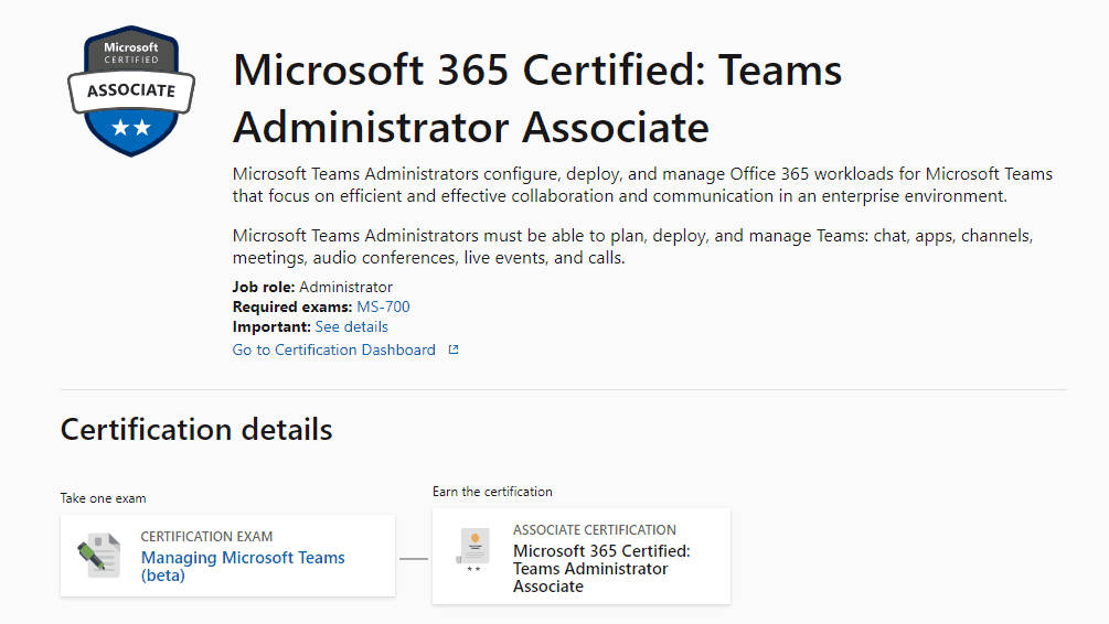 The MS-700: Managing Microsoft Teams (beta) exam pass qualifies you as a Microsoft 365 Certified: Teams Administrator Associate