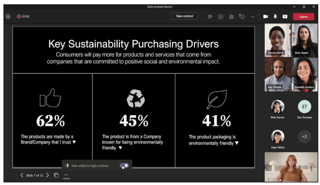Attendees can also personally put the slides into “high contrast mode” for improved accessibility. This only affects their view of the slides.