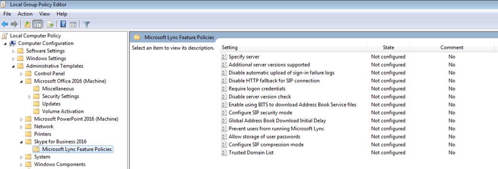 Group Policy is falling out of fashion these days, with more settings being defined in-band which is easier for Office 365 and non-domain joined machines, however Office 2016 does still have some Skype for Business GPO settings: