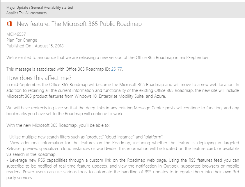 Interesting news, the existing Office 365 roadmap site, https://products.office.com/business/office-365-roadmap , will be replaced with a new “Microsoft 365” roadmap site.