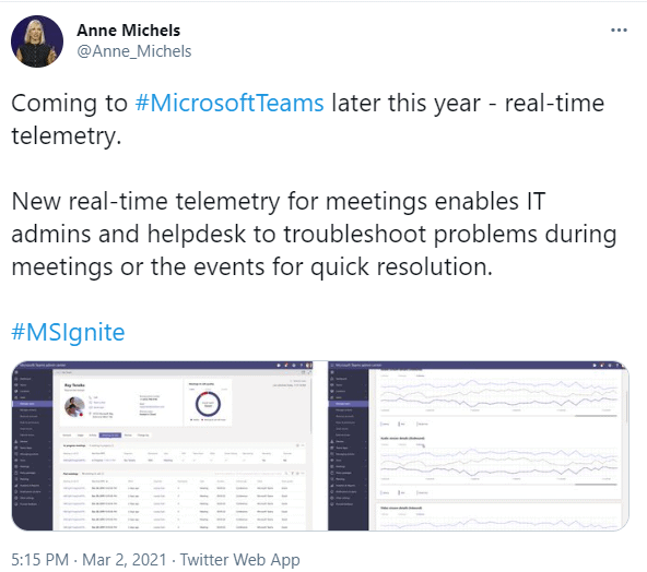 Announced at Microsoft Ignite (I didn’t see it in a session, but if you did please let me know which one) by Anne Michels, Head of Product Marketing, Microsoft Teams Core, EDU and Free. Coming in April is real-time telemetry for meetings, enabling troubleshooting problems during meetings or events. The data is generated in Teams Admin Center reports and Meetings reports and provides detailed information about different network parameters like Jitter, Packet-loss, latency and Frames per second.