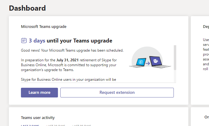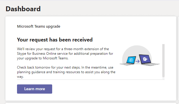 If you haven’t had your upgrade yet, you can still request an extension beyond 31st July. Note your request will need to be approved by Microsoft ahead of the 31st of July. If your assisted upgrade is scheduled for a date after July 31, 2021. Your organization will be able to use Skype for Business Online until your upgrade is complete.