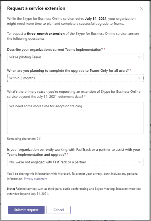 Requesting a Skype for Business Online Service Extension Beyond 31st July 2021