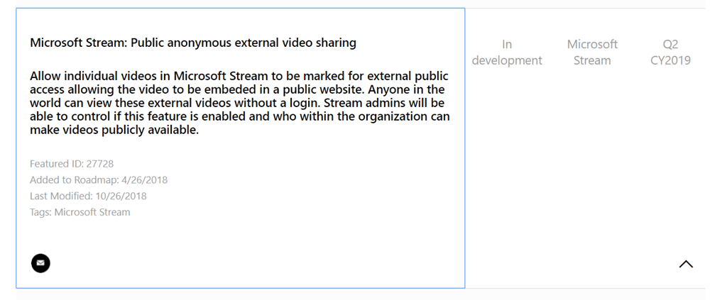 Currently the external sharing Stream videos feature has been bumped to Q4 of 2020 (end of 2020).