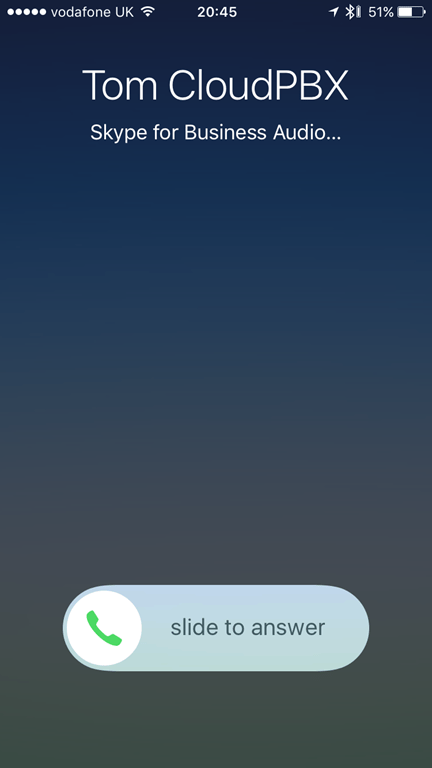 Here is an incoming SfB Call while the iPhone is locked, noticed it identifies as a SfB Audio call and I can answer right from the lock screen. “Tom CloudPBX” is the calling number