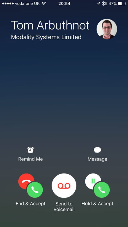 Here, I’m on a SfB call with “Tom CloudPBX” , and a second incoming call comes in from “Tom Arbuthnot”. My audio continues on the SfB Call and I get options to End the SfB Call and accept the new call, send the new call to voicemail or hold the SfB call and answer the new call