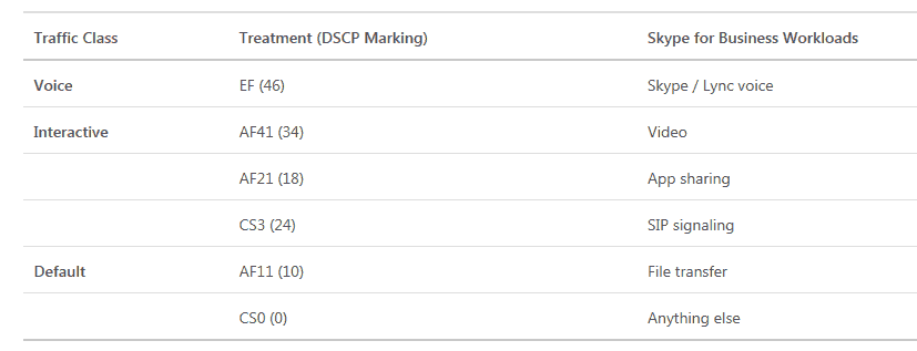 Skype for Business Online Quality of Service DSCP Markings and Port Ranges