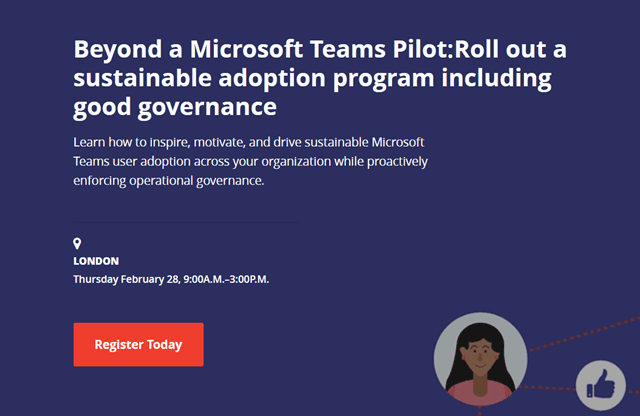 I’m excited to be speaking at AvePoint’s, Beyond a Microsoft Teams Pilot: Roll out a sustainable adoption program including good governance.