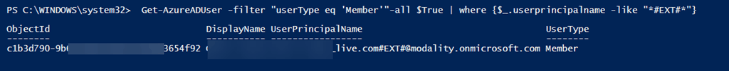 Get-AzureADUser -filter “userType eq ‘Member'”-all $True | where {$_.userprincipalname -like “*#EXT#*”}
