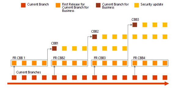 - At that point the build forks to the red current branch (CB) that gets new features and fixes monthly to users on the CB branch, and to orange FR CBB1, which is the build that includes new features for Business to test,