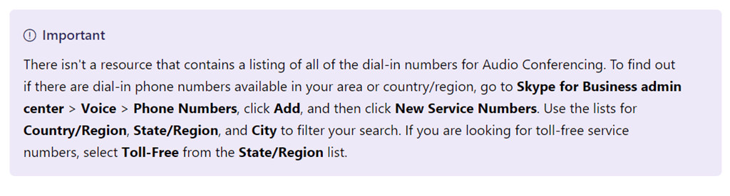 Thanks you for all these information. However my concern is how can I display multiple dial-in numbers whenever we create Skype/Team meeting. At the moment, it only includes one default dial-in number, however I would like to add multiple location’s numbers. I can see the available numbers list on Microsoft bridge from Skype for Business admin center > audio conferencing.