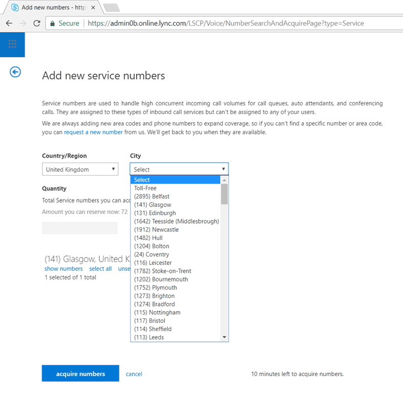 By default you have a standard “number set”. You can also add additional numbers if you need them. For example if the default UK number is a London number but you want to offer a number of local to your office/location in Glasgow, you can add a “service number”. This is also how you add Toll-Free numbers.