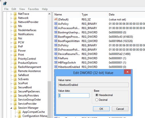 Step 7: Locate HiberbootEnabled there and double-click the entry and Change the value of the key to 0 to deactivate Fast Boot.